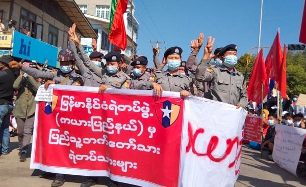 ကယားပြည်နယ် လွိုင်ကော်မြို့တွင် ဖေဖော်ဝါရီ ၁၀ ရက်က ဆန္ဒပြပွဲတွင် ပြည်သူနှင့်အတူ ဆန္ဒဖော်ထုတ်ခဲ့သည့် ရဲတပ်ဖွဲ့ဝင်များက ခေတတ္တရဲများဖြစ်ကြောင်း...