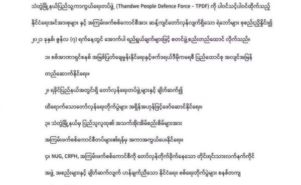 နိုင်ငံတကာကသတ်မှတ်ထားသည့် စည်းမျဉ်းစည်းကမ်း၊ ကျင့်ဝတ်များကို လိုက်နာရန် ပြည်သူ့ကာကွယ်ရေးတပ်ဖွဲ့များကို အမျိုးသားညီညွတ်ရေးအစိုးရ (NUG)...