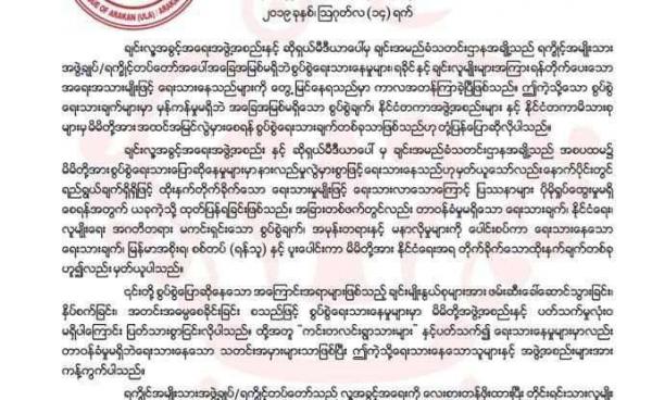 ချင်းလူ့အခွင့်အရေးအဖွဲ့အစည်း (CHRO) နှင့် ချင်းအမည်ခံသတင်းဌာနအချို့မှ စွပ်စွဲရေးသားမှုများကို ကန့်ကွက်ကြောင်း ရက္ခိုင့်အမျိုးသားအဖွဲ့ချုပ်မှ သြဂုတ်လ...