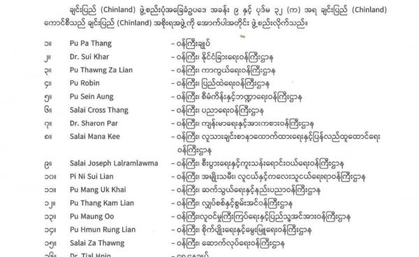 Chinland Council က မတူပီ NLD အမတ် Pu Pa Thang ဝန်ကြီးချုပ်အဖြစ်ဦးဆောင်မယ့် ချင်းပြည်အစိုးရအဖွဲ့ကို ၀န်ကြီးဌာန ၁၄ ခုဖြင့် ဖွဲ့စည်းပြီဖြစ်ကြောင်း...