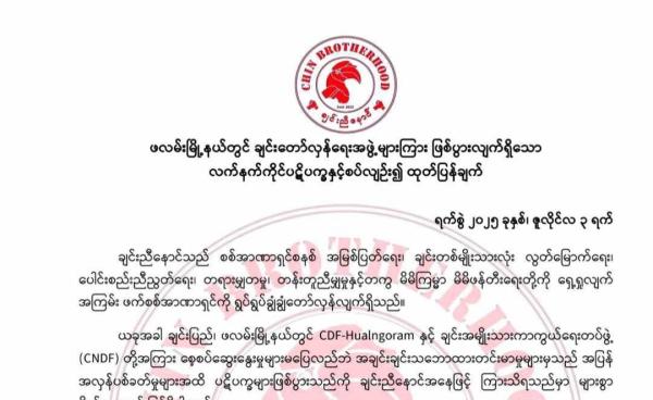 ချင်းပြည်နယ်တောင်ပိုင်း၊ မတူပီမြို့နယ်မှာ Chinland Council လက်အောက်ခံ CDF – Matupi တပ်ရင်း ၃ နယ်မြေကို ချင်းညီနောင်အဖွဲ့(CB)အဖွဲ့ဝင်...