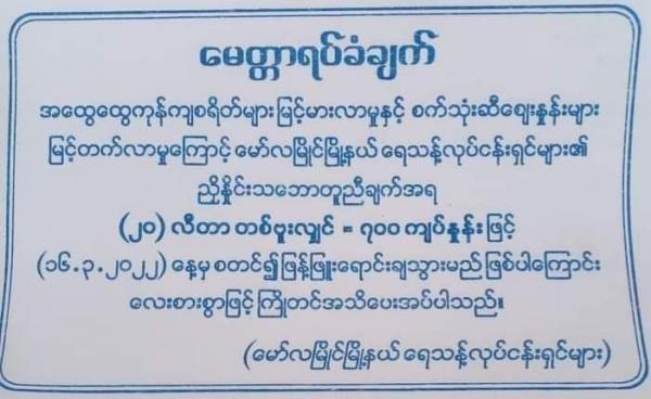 မွန်ပြည်နယ်၊ မော်လမြိုင်မြို့တွင် သောက်ရေသန့်တစ်ဗူး ကျပ် ၇၀၀ ဖြစ်သွားပြီး ယခင်ဈေးထက် ကျပ် ၂၀၀ စျေးတက်သွားသည်။ မော်လမြိုင်မြို့နယ်အတွင်း...