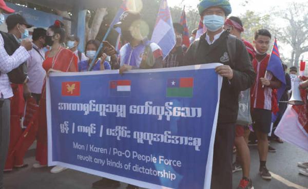 ဗညားပိုင် — “အာဏာရှင်ဟူသမျှ တော်လှန်သော”ခေါင်းစည်းစာတမ်းဖြင့် မွန်၊ ကရင်၊ ပအိုဝ်း တိုင်းရင်းသားလူငယ်များနှင့် မြို့ခံပြည်သူလူထုအင်အား ၁၀၀၀ ခန့်...