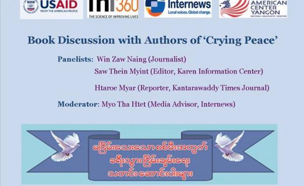 'မငြိမ်းသေးသောစစ်မီးအတွက် ခရီးသွားငြိမ်းချမ်းရေး သတင်းဆောင်ပါးများ' ကိုရေးသားခဲ့သူများနှင့် ပရိသတ်များ ဆွေးနွေးပွဲကို ရန်ကုန်ရှိ အမေရိကန်စင်တာ၌...