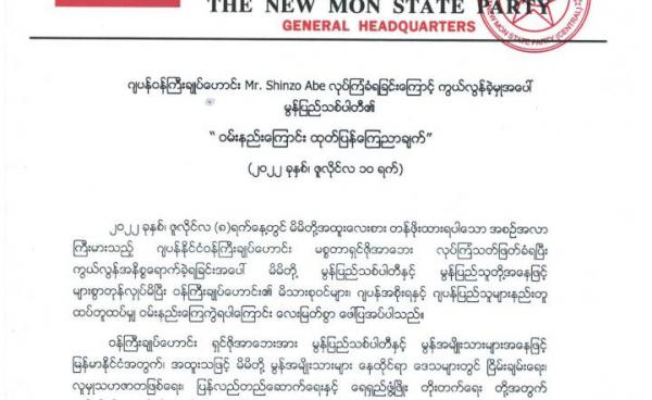 ဂျပန်နိုင်ငံဝန်ကြီးချုပ်ဟောင်း မစ္စတာရှင်ဇိုအာဘေး လုပ်ကြံသတ်ဖြတ်ခံရပြီး ကွယ်လွန်ရခြင်းအပေါ် မွန်ပြည်သစ်ပါတီ (NMSP) နှင့် မွန်ပြည်သူတို့အနေဖြင့်...