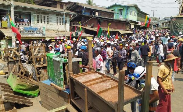 မတ်လ ၂၅ ရက်နေ့ ဖားကန့်မြို့နယ် ဆိပ်မူနှင့် လုံးခင်းသပိတ်စစ်ကြောင်း မှော်ပုံထိချီတက်ဆန္ဒပြရန် ပြင်ဆင်ထားသော်လည်း မှော်ပုံရွာအဝင်တွင် အာဏာသိမ်းစစ်တပ်...