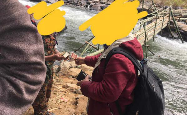 ကချင်ပြည်နယ် တရုတ်နယ်စပ် ကန်ပိုင်တီလမ်းကြောင်းမှာ ကျိုးကျပျက်စီးသွားသော ဆဒုံး ခုနှစ်ရောင်စုံတံတား အောက် ယာယီဆောက်ထားသော ဝါးတံတားတွင် အစိုးရ...