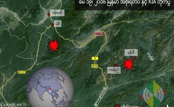 မြန်မာ အစိုးရတပ်နှင့် ကချင် လွတ်လပ်ရေး တပ်မတော် KIA ကြား ကချင်ပြည်နယ်နှင့် ရှမ်းပြည်နယ် မြောက်ပိုင်း ဒေသ နှစ် ခုတွင် မေ ၁၉၊ ယနေ့ တိုက်ပွဲများ...
