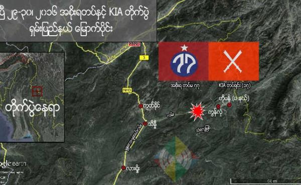 ကချင်ပြည်နယ် ကျောက်စိမ်းမှော် ဖားကန့်မြို့အနီး အစိုးရတပ်နှင့် ကချင် လွတ်လပ်ရေး တပ်မတော် KIA တပ်ရင်း (၆) ကြား ယနေ့ မွန်းလွဲပိုင်းမှ ညနေပိုင်း အထိ...