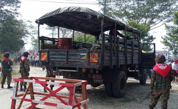 ကချင်ပြည်နယ်၊ ဗန်းမော်မြို့၊ မအူပင်ကျေးရွာဘက်ကို စစ်ကြောင်းထိုးလာသည့် စစ်ကောင်စီတပ်၏ ကားကို ကချင်လွတ်လပ်ရေးတပ်မတော် KIA နှင့် PDF ပူးပေါင်းတပ်တို့က...