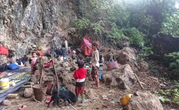 ကယား (ကရင်နီ) ပြည်၊ ဖရူဆိုမြို့နယ်ထဲ စစ်ကောင်စီ၏ လေယာဉ်ဖြင့် ဗုံးကြဲတိုက်ခိုက်ခံရပြီးနောက် တော တောင်ထဲတွင် ထွက်ပြေးတိမ်းရှောင်နေကြရသည့် စစ်ဘေးရှောင်...