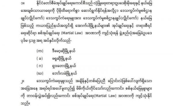 ကရင်နီပြည်က ဒီးမော့ဆို၊ ဖရူဆို၊ ဘောလခဲနဲ့ ရှားတော မြို့နယ်လေးခုကို ဒီကနေ့ ဖေဖော်ဝါရီလ ( ၂ ) ရက်နေ့မှာ စစ်အုပ်ချုပ်ရေးအမိန့်ကြေညာလိုက်တယ်လို့...