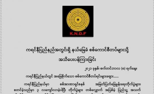 ကရင်နီပြည်နယ်အခြေစိုက် စစ်ကောင်စီတပ်ရင်းတွေအနေနဲ့ အချိန်နောက်မကျခင် ကရင်နီအမျိုးသား ကာကွယ်ရေးတပ် KNDF နဲ့ အမြန်ဆုံး လာရောက်ပူးပေါင်းပေးဖို့...
