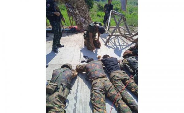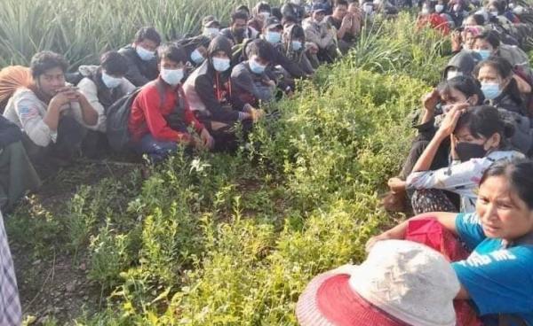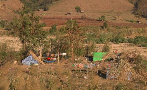 ထိုင်းနဲ့ မြန်မာနှစ်နိုင်ငံကို ခြားထားတဲ့ သောင်ရင်းမြစ်ကမ်းနံဘေးတစ်နေရာက မြက်ရိုင်းပင်တောထဲမှာ တာလပတ်၊ မြက်ရိုင်းပင်တွေနဲ့ မိုးထား၊ ကာထားတဲ့ တဲလေးတွေ...