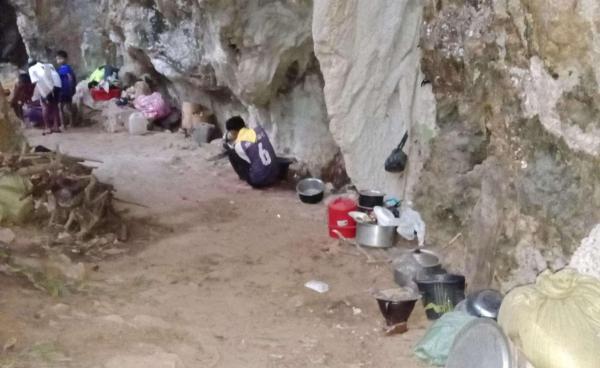 စစ်ကောင်စီ၏ လက်နက်ကြီး ရမ်းသမ်းပစ်ခတ်မှုများကြောင့် နီးစပ်ရာ ကျောက်ဂူများထဲသို့ ပြောင်းရွှေ့နေထိုင်နေရသည့် ဒေသခံရွာသားအချို့။ ကရင်အမျိုးသားအစည်းအရုံး...