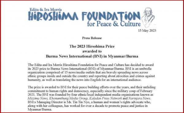 ငြိမ်းချမ်းရေးနှင့် ယဥ်ကျေးမှုလုပ်ငန်းများကို စောင့်ကြည့်ဖော်ထုတ်ခြင်းအတွက် ပေးအပ်သည့် ၂၀၂၃ ခုနှစ်၏ ဟီရိုရှီးမားဖောင်ဒေးရှင်းဆုကို...