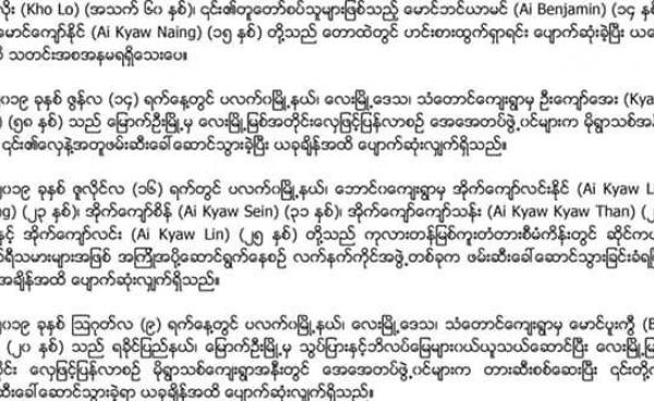 ချင်းပြည်နယ်၊ ပလက်ဝမြို့နယ် နန်းချောင်းကျေးရွာသားတစ်ဦး သြဂုတ်လ (၁၀) ရက်နေ့တွင် နန်းပတာကျေးရွာသို့သွားရာလမ်းတွင် ပျောက်ဆုံးကာ...