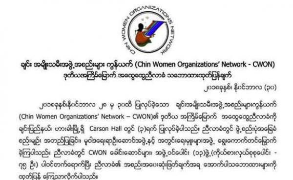 ချင်းပြည်နယ်၊ ဟားခါးမြို့တွင် ဒုတိယအကြိမ်မြောက် ချင်းအမျိုးသမီးအဖွဲ့အစည်းများကွန်ယက် (Chin Women Organization Network) ညီလာခံကို နိုဝင်ဘာ (၂၈)...