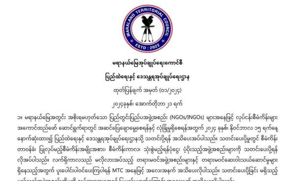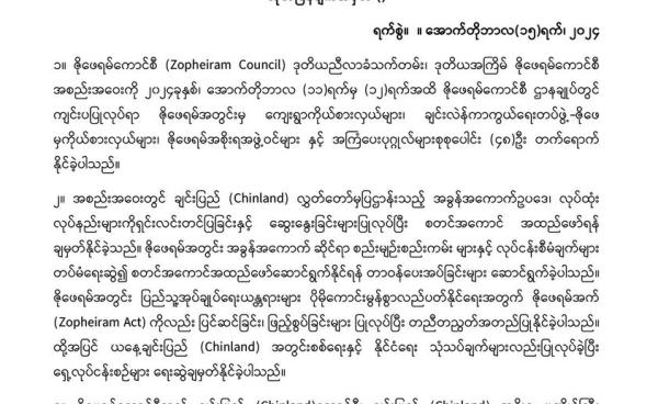 ချင်းပြည်ကောင်စီ၊ ချင်းပြည်လွှတ်တော်မှ ပြန်ဌာန်းထားသည့် အခွန်အကောက်ဥပဒေကို ဇိုဖေရမ်ဒေသအတွင်း စတင်အကောင်အထည်ဖော်တော့မည်ဖြစ်ကြောင်း ဇိုဖေရမ်ကောင်စီထံမှ...