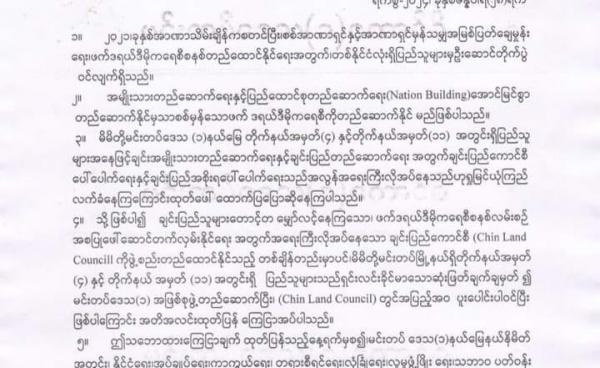 ချင်းပြည်တွင် ကိုယ်ပိုင်ပြဌာန်းအုပ်ချုပ်မှုဖြင့် လည်ပတ်သော ချင်းလန်းကောင်စီ၏ ချင်းပြည်အစိုးရအဖွဲ့နှင့် လွှတ်တော်သည် ရက် (၁၀၀) စီမံကိန်းကို ချမှတ်ပြီး...