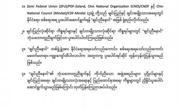 ချင်းပြည်နှင့် ချင်းအမျိုးသားအရေးတွင် နိုင်ငံရေး၊ စစ်ရေးများကို ပူးပေါင်းဆောင်ရွက်ရန် “ချင်းညီနောင်” မဟာမိတ်အဖြစ် ဒီဇင်ဘာလ ၃၀ ရက်က...