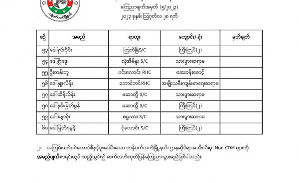 ချင်းပြည်နယ်၊ ကန်ပက်လက်မြို့နယ် အတွင်းက စစ်ကောင်စီနှင့် ပူးပေါင်းဆောင်ရွက်နေသော ကျန်းမာရေးဌာနမှ Non-CDM (၆၀) ဦးကို အမည်ပျက်ဝန်ထမ်းများအဖြစ်...