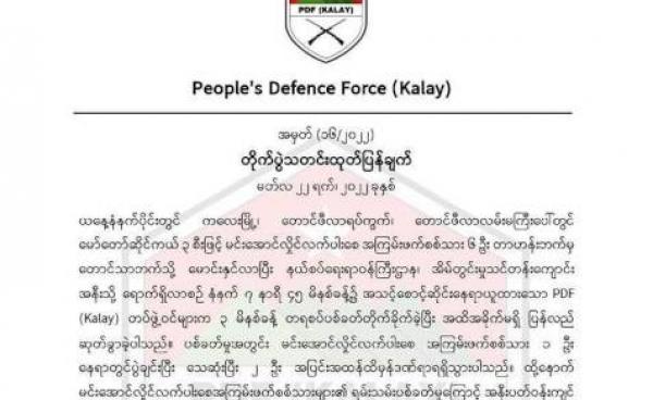 ကလေးမြို့ တော်ဖီလာရပ်ကွက် နယ်စပ်ရေးရာဝန်ကြီးဌာန၊ အိမ်တွင်းမှုသင်တန်းကျောင်းအနီးတွင် ယနေ့နံနက်ပိုင်းက စစ်ကောင်စီတပ်ဖွဲ့နှင့် PDF (Kalay) တပ်ဖွဲ့တို့...