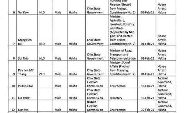 ချင်းပြည်နယ် ဝန်ကြီးချုပ်နှင့် ဝန်ကြီးတစ်ချိူ့အပါအဝင် လွတ်တော်ဥက္ကဌများကို တပ်မတော်က ဆက်လက်ဖမ်းဆီးထိန်း သိမ်းထားဆဲဖြစ်ပြီး ကျန်ဝန်ကြီးများကိုမူ...
