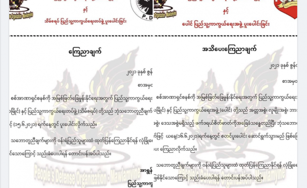 မော်လမြိုင် ပြည်သူ့ကာကွယ်ရေးအဖွဲ့နှင့် မကွေး ပြည်သူ့ကာကွယ်ရေးတပ်ဖွဲ့တို့ ဘုံသဘောတူညီချက် (၇) ချက်ဖြင့် ပူးပေါင်းလိုက်ကြောင်း ကြေငြာချက်ထုတ်ပြန်ခဲ့သည်...