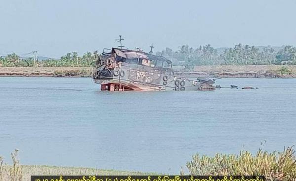 ရခိုင်ပြည်နယ်တိုက်ပွဲများတွင် စစ်ကောင်စီ၏ ရေယာဉ်များ AA ၏ တိုက်ခိုက်ခံရပြီး နစ်မြုပ်လျက်ရှိရာ မင်းပြားမြို့နယ်တွင် စစ်ကောင်စီ၏ သင်္ဘောတစင်း...