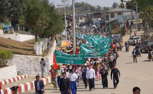 ၂၀၁၇ ကျောက်မျက်ဥပဒေကြမ်းကို ကချင်ပြည်နယ် ဖားကန့်မြို့ မော်ဝမ်းရပ်ကွက်ရှိ ကျောက်တိုင်ကွင်းတွင် ဒေသခံ ရာချီက မတ်လ ၁၉ ရက်က ဆန္ဒဖော်ထုတ်ခဲ့သည်။