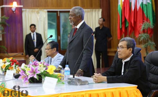 ရခိုင်ပြည်နယ်ဆိုင်ရာအကြံပေးကော်မရှင်၏ အပြီးသတ်အကြံပြုချက် အစီရင်ခံတင်သွင်းချိန်တွင် အဖွဲ့ခေါင်းဆောင်ဖြစ်သူ မစ္စတာကိုဖီအာနန် မြန်မာနိုင်ငံသို့...