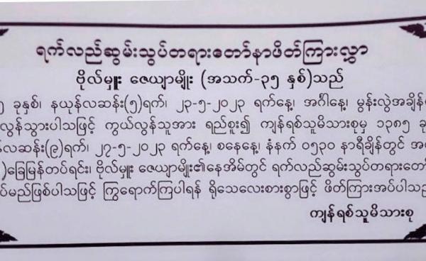 ရန်ကုန်တိုင်း၊ စမ်းချောင်းမြို့နယ်၊ ဝေဠုဝန်မြောက်ရပ်ကွက်မှ လူငယ် ၁၆ ဦးအား အရပ်ဝတ် စစ်ကောင်စီ တပ်သားများက မေလ ၂၅ ရက်နေ့က တစ်အိမ်တက်ဆင်း...