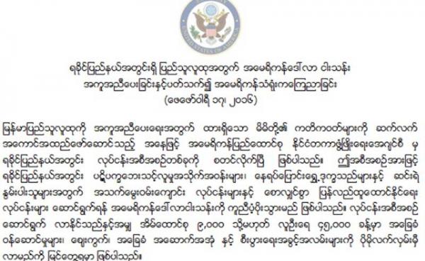 ရခိုင်ပြည်နယ်အတွင်း အသက်မွေးဝမ်းကျောင်းလုပ်ငန်းများနှင့် စောလျှင်စွာ ပြန်လည်ထူထောင်နိုင်ရေး လုပ်ငန်းများ ဆောင်ရွက်ရန် အမေရိကန်ပြည်ထောင်စု...