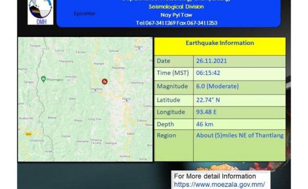 ချင်းပြည်နယ်၊ ဟားခါးမြို့နယ်တွင် ယနေ့ နိုဝင်ဘာလ ၂၆ ရက် နံနက် ၆နာရီ ၁၅ မိနစ်ကျော်အချိန်တွင် အင်အားအသင့်အတင့်ရှိသော ရစ်(ခ်)တာစကေး ၆ အဆင့်ထိ...