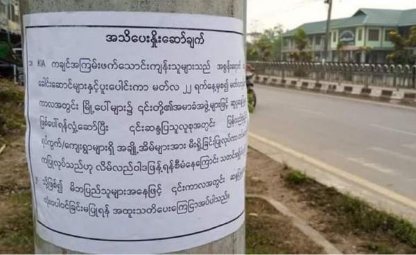 ကချင်ပြည်နယ်မိုးညှင်းမြို့အတွင်း စစ်ကောင်စီဖက်က မိုးညှင်းပြည်သူများ KIAနှင့်ဆက်သွယ်ပူးပေါင်းခြင်းမပြုရန် အသိပေးစာများ ကိုမြို့တွင်းနေရာအနှံ့...