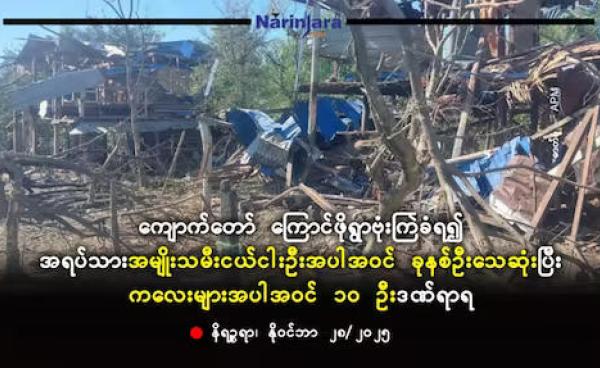 ရခိုင်ပြည်၊ ကျောက်ဖြူမြို့နယ်ရှိ တောင်ငူရွာဗုံးကြဲခံရ၍ သက်ကြီးပိုင်းအမျိုးသမီးတစ်ဦးအပါအဝင် အမျိုးသမီးသုံးဦး သေဆုံးသွားပြီး ကျောင်းသူနှစ်ဦးအပါအဝင်...
