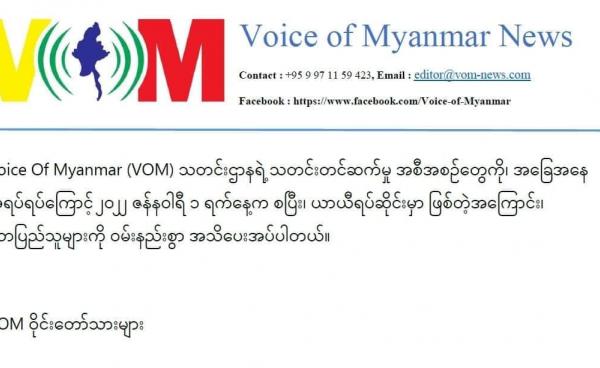 မန္တလေးအခြေစိုက် VOM (Voice of Myanmar) သတင်းဌာနကို လာမည့်ဇန်နဝါရီ ၁ ရက်မှစ၍ ယာယီရပ်ဆိုင်းမည်ဖြစ်ကြောင်း ယနေ့ ဒီဇင်ဘာ ၂၄ ရက် နေ့စွဲဖြင့်...