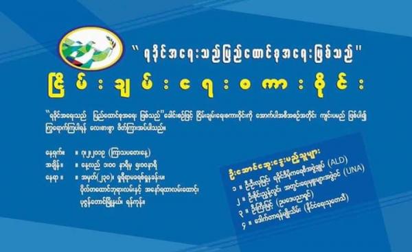 “ ရခိုင်အရေးသည် ပြည်ထောင်စုအရေးဖြစ်သည်” ခေါင်းစဉ်ဖြင့် ငြိမ်းချမ်းရေးစကားဝိုင်းကို ရန်ကုန်မြို့ ၊ ပုဇွန်တောင်မြို့နယ်၊ ဗိုလ်တထောင်ဘုရားလမ်းနှင့်...