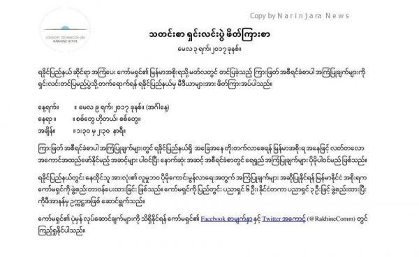 (၄) ကြိမ်မြောက် ရခိုင်အမျိုးသားနေ့ကို ရန်ကုန်၌ ကျင်းပရေးနှင့် ပတ်သက်ပြီး သတင်းစာရှင်းလင်းပွဲကို မေလ ၈ ရက်နေ့ ညနေ ၃ နာရီတွင် ရန်ကုန်တိုင်းဒေသကြီး...