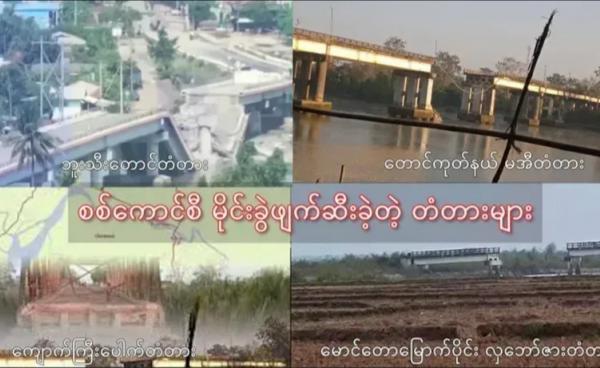 ရခိုင်ပြည်တောင်ဘက်ပိုင်း တောင်ကုတ်မြို့ကို အာရက္ခစစ်သည်တော်များ ဝင်ရောက်တိုက်ခိုက်မည်ကို စိုးရိမ်သဖြင့် ကားလမ်းပေါ်ရှိ ကွမ်းစမ်းတံတားကို စစ်ကောင်စီ...