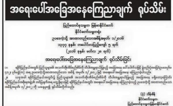 ရခိုင်ပြည်နယ် အတွင်း ထုတ်ပြန်ထားသော အရေးပေါ် အခြေအနေ ကြေညာချက် အမိန့် (၁/၂၀၁၂) ကို ၂၀၁၆ မတ်လ ၂၈ ရက်နေ့က နိုင်ငံတော် သမ္မတမှ ရုပ်သိမ်းလိုက်ပြီ...