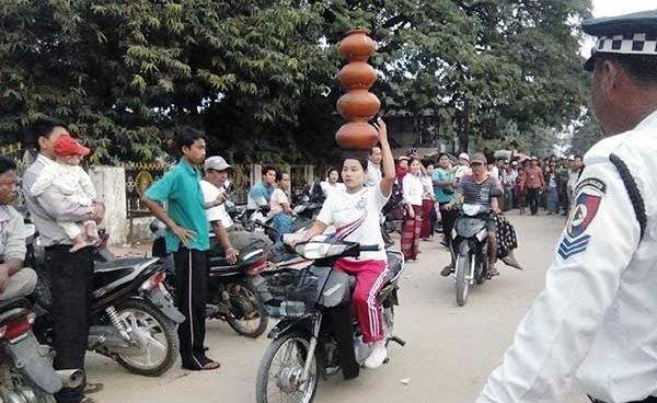 ကျောက်ဖြူမြို့၌ပြုလုပ်သော (၄၁)ကြိမ်မြောက် ရခိုင်ပြည်နယ်နေ့ အခမ်းအနားတွင် ရေအိုးလေးလုံးကို ခေါင်းပေါ်တင်ပြီး ဆိုင်ကယ်စီးပြသူ အမျိုးသမီး တစ်ဦးအား...