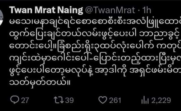 စစ်ကာင်စီတပ်သားများကို ရည်ရွယ်ပြီး ရက္ခိုင့်တပ်တာ် (AA) စစ်ဦးစီးချုပ် ဗိုလ်ချုပ်ထွန်းမြတ်နိုင်က မသေ၊မနာချင်ရင် စောစောစီးစီး အလံဖြူထောင်ရန် သူ၏...