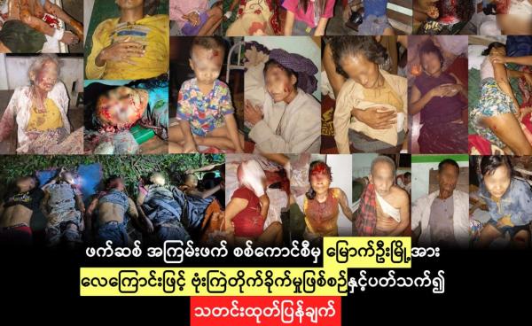 ရခိုင်ပြည်၊ ကျောက်ဖြူမြို့နယ်၊ ဇင်ချောင်းတိုက်နယ်ဖက်သို့ အကြမ်းဖက်စစ်တပ်၏နေဗီက လက်နက်ကြီးကျည်များဖြင့်ပစ်ခတ်၍ အပြစ်မဲ့အရပ်သားတစ်ဦးဒဏ်ရာရသွားကြောင်း...
