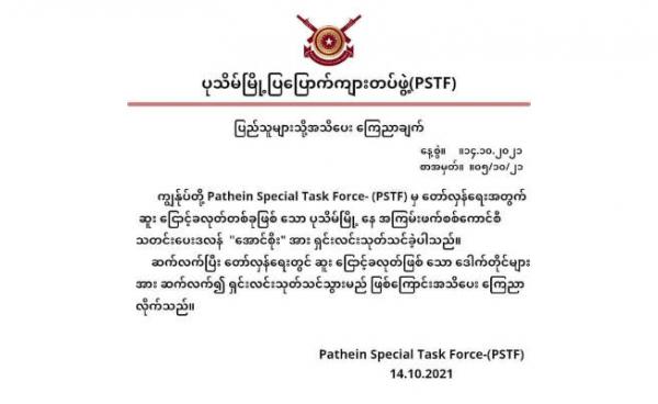 ပုသိမ်မြို့ အမှတ် ၈ ရပ်ကွက်မှ စစ်ကောင်စီသတင်းပေးဟု နာမည်ထွက်နေသူတစ်ဦး အောက်တိုဘာ ၁၄ ရက်နေ့ ည ၇ နာရီခန့်က ပစ်သတ်ခံ လိုက်ရသည်။ အမှတ် ၈ ရပ်ကွက်...