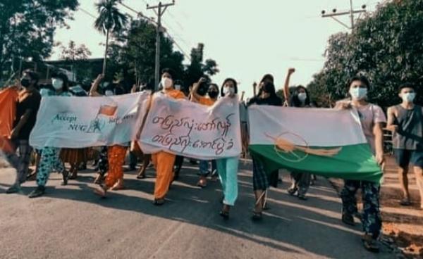 ထားဝယ်ခရိုင် လောင်းလုံမြို့နယ် အင်းဇောက်ကျေးရွာတွင် သပိတ်စစ်ကြောင်း စတင်ထွက်ခွာရန် ပြင်ဆင်နေစဉ် အရပ်ဝတ်ဝတ်ဆင်ထားသည့် စစ်ကောင်စီတပ်ဖွဲ့ဝင်များက...