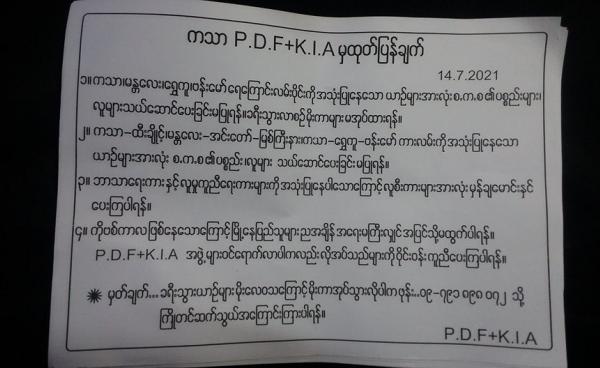 ကသာ-ဗန်းမော် ရေလမ်းကုန်းလမ်းသွားလာသူများ စစ်ကောင်စီနှင့်ပတ်သက်သည့် လူနှင့်ပစ္စည်းများ တင်ဆောင်ခြင်းမပြုရန်၊ မိုးကာများအုပ်ပြီး မမောင်းရန် ကသာ...