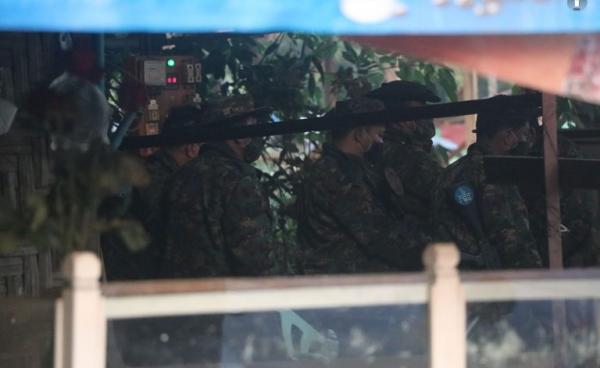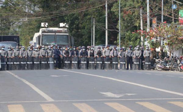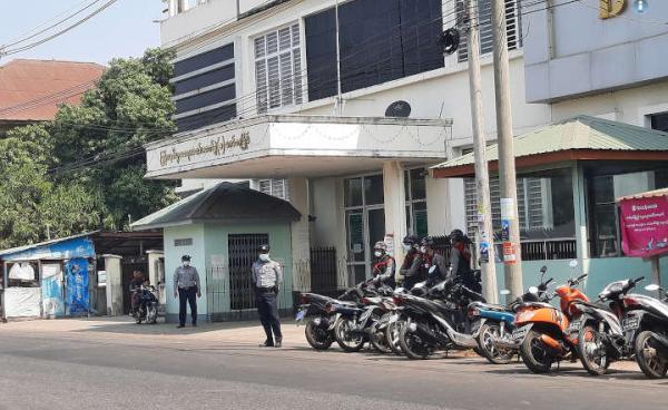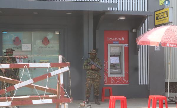 ကချင်ပြည်နယ်၊ မြစ်ကြီးနားမြို့ ရှိ ဘဏ်များရှေ့တွင် ဖေဖော်ဝါရီလ ၁၅ ရက်နေ့ (ယနေ့) တွင် စစ်သားများနှင့် ရဲတပ်ဖွဲ့ဝင်များတင်းကြပ်စွာ နေရာချထားသည်ကို...