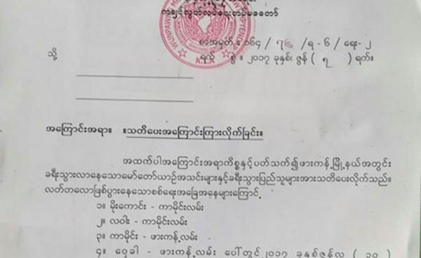 လက်ရှိဖြစ်ပေါ်နေသော စစ်ရေးအခြေအနေအရ ဖားကန်မြို့နှင့် ပတ်ဝန်းကျင်လမ်းများတွင် မော်တော်ယာဉ်များ ည ရ နာရီ နောက်ပိုုင်း သွားလာခြင်း မပြုရန်...